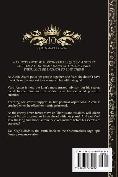 A princess whose mission is to be queen. A secret shifter, at the right hand of the king. Will their love be enough to bind them? As Alecia Zialni pulls her people together, she fears she doesn't have the skills or the support to accomplish her ultimate goal. Vard Anton is now the king's most trusted advisor, but his secrets could topple him, and his sudden rise has delivered powerful enemies. Yearning for Vard's support in her political aspirations, Alecia is crushed when he offers her marriage instead. As the enemy elven forces move on Thorius and its allies, will Alecia accept Vard's proposal or forge ahead with her plans? And can Vard save the king and Thorius from the elven menace before his secrets are exposed? The King's Blade is the exciting tenth book in the Queenmakers saga epic fantasy romance series. If you like strong heroines, forbidden passion, political intrigue and mythical creatures, you'll love Bernadette Rowley's captivating adventure.