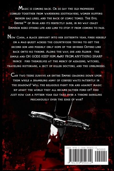 Magic is returning. Or so say the old prophesies cobbled from wandering soothsayers, women huffing broken gas lines, and the back of comic tomes. The Evil Empire¿ of Avar and its perfectly sane, in no way crazy Emperor risks others' life and limb to stop it from coming to pass. Ciara, a black servant into her sixteenth year, finds herself on a quest across the countryside to get the second son and only hope of the severed Ostero line onto his throne. Along the way, she and Aldrin - the rather simple and OH GODS KEEP HIM AWAY FROM ANYTHING SHARP prince - find themselves at the mercy of assassins, witches, traveling historians, killer doctors, and the unblinkers. Can two teens survive an Empire crashing down upon them while a shambling army of corpses waits patiently in the shadows? Will the religious fight for and against magic rip apart the world they all became rather fond of? And just how can a fifteen year old take over a throne dangling precariously over the edge of war?