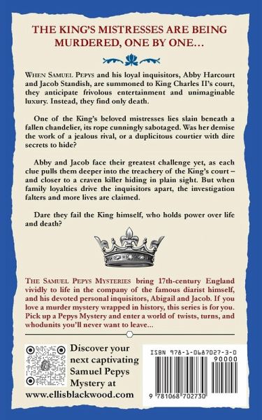 The King's mistresses are being murdered, one by one... When Samuel Pepys and his loyal inquisitors, Abby Harcourt and Jacob Standish, are summoned to King Charles II's court, they anticipate frivolous entertainment and unimaginable luxury. Instead, they find only death. One of the King's beloved mistresses lies slain beneath a fallen chandelier, its rope cunningly sabotaged. Was her demise the work of a jealous rival, or a duplicitous courtier with dire secrets to hide? Abby and Jacob face their greatest challenge yet, as each clue pulls them deeper into the treachery of the King's court - and closer to a craven killer hiding in plain sight. But when family loyalties drive the inquisitors apart, the investigation falters and more lives are claimed. Dare they fail the King himself, who holds power over life and death? The Samuel Pepys Mysteries bring 17th century England vividly to life, in the company of the celebrated diarist himself, and his personal inquisitors, Abby and Jacob. If you love your cozy mysteries wrapped in history, this series is for you. Pick up a copy to enter a world of hidden secrets and whodunits you'll never want to leave...