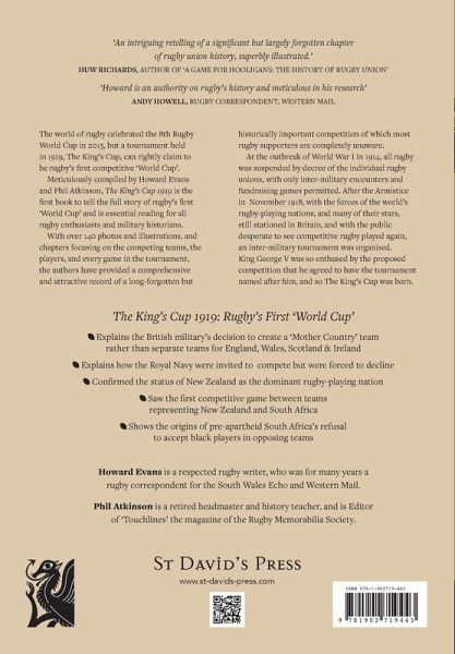 The King's Cup, held in Britain in 1919, can rightly claim to be rugby's first competitive 'World Cup'. Meticulously compiled by Howard Evans and Phil Atkinson, The King's Cup 1919 is the first book to tell the full story of rugby's first 'World Cup' and is essential reading for all rugby enthusiasts and military historians.