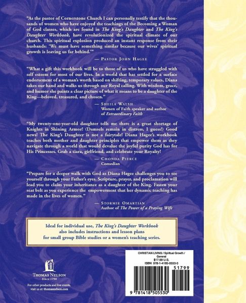 This 13 week, interactive study looks at issues many women face today and reminds them of their inherent value as daughters of the one true King. Mordecai's challenge to Esther, "Were you not born for such a time as this?" is repeated for all women throughout the ages, says Diana Hagee. Every woman has a divine destiny. But women cannot fulfill that goal unless they understand His biblical guidelines. In this interactive workbook, Diana leads women through a self-examination of their lives and their goals from God's perspective, not the secular society's. Topics such as self-esteem, diligence, attitude, goal setting and stewardship encourage women to establish a strong foundation for growth while learning to see themselves in a new light. Through scripture, thought-provoking questions and answers, prayers, practical advice and devotional ideas, women learn how valuable they are to God and how they can have an intimate relationship with Him while evaluating the standards that make them a daughter of the King.
