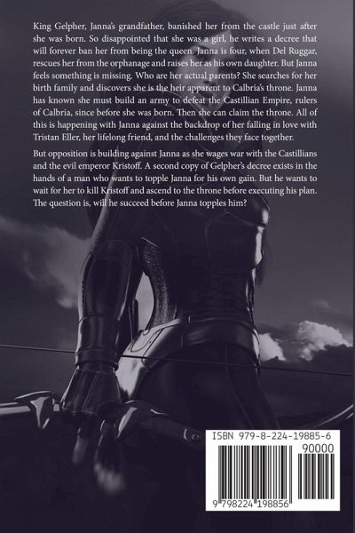 King Gelpher, Janna's grandfather, banished her from the castle just after she was born. So disappointed that she was a girl, he writes a decree that will forever ban her from being the queen. Janna is four, when Del Ruggar, rescues her from the orphanage and raises her as his own daughter. But Janna feels something is missing. Who are her actual parents? She searches for her birth family and discovers she is the heir apparent to Calbria's throne. Janna has known she must build an army to defeat the Castillian Empire, rulers of Calbria, since before she was born. Then she can claim the throne. All of this is happening with Janna against the backdrop of her falling in love with Tristan Eller, her lifelong friend, and the challenges they face together. But opposition is building against Janna as she wages war with the Castillians and the evil emperor Kristoff. A second copy of Gelpher's decree exists in the hands of a man who wants to topple Janna for his own gain. But he wants to wait for her to kill Kristoff and ascend to the throne before executing his plan. The question is, will he succeed before Janna topples him?
