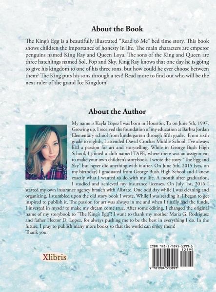 The Kings Egg is a beautifully illustrated Read to Me bed time story. This book shows children the importance of honesty in life. The main characters are emperor penguins named King Ray and Queen Loya. The sons of the King and Queen are three hatchlings named Sol, Pop and Sky. King Ray knows that one day he is going to give his kingdom to one of his three sons, but how could he ever choose between them? The King puts his sons through a test! Read more to find out who will be the next ruler of the grand Ice Kingdom!