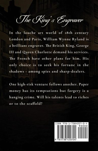 In 18th century London and Paris, William Wynne Ryland is a brilliant engraver. The British King, George III and Queen Charlotte demand his services. The French have other plans for him. His only choice is to seek his fortune in a shadow world of spies and sharp-dealers. A life of ease and plenty is just out of reach. One high-risk venture follows another. Papermoney has its temptations but forgery is a hanging crime. Could his engraving lead to riches or to the scaffold? The King's Engraver is inspired by the life story of a supremely talented man at the heart of a louche art world. William is feted in both Georgian London and pre-revolutionary Paris. But these are challenging times. France and Britain are rivals in art and war. William weaves his way between fearful threats of invasion and the promise of fortunes to be made where art and money meet. This is biographical historical fiction, the fruit of years of research, filling in the gaps between the evidence to draw out the emotional force that drives William towards a destiny that belies the promise of his glittering career. Enjoy this tale of one man and two cities, featuring an international cast of characters from the Comte de Broglie, the head of Louis XV's secret spy network to Angelica Kauffmann, one of only two female founders of the Royal Academy.