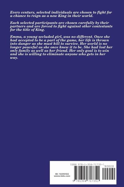 Every century, selected individuals are chosen to fight for a chance to reign as a new King in their world. Each selected participants are chosen carefully by their partners and are forced to fight against other contestants for the title of King. Emma, a young secluded girl, was no different. Once she had accepted to be a part of the game, her life is thrown into danger as she must kill to survive. Her world is no longer peaceful as she once knew it to be. She had lost her only family as well as her friend. Her only goal is to win and she is willing to eliminate anyone who gets in her way.