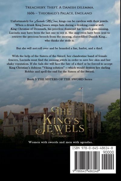 Treachery. Theft. A Danish dilemma. 1606 - Theobald's Palace, England Unfortunately for Lucinda McCrae, kings can be careless with their jewels. When a drunk King James swaps hats during a drinking contest with King Christian of Denmark, his priceless diamond hat brooch goes missing. Lucinda may have been the last one to see it. She may even have been sent to retrieve the precious brooch from the snoring, claret-filled Danish King...who thinks she stole it. But she will not roll over and be branded a liar, harlot, and a thief. With the help of the Sisters of the Sword, her clandestine band of female fencers, Lucinda must find the missing jewels in order to save her skin and her shaky reputation. If she fails she will face the fate of a thief or be forced to accept King Christian's dubious "Viking solution" - which would destroy her darling Robbie and spell the end for the Sisters of the Sword. Book 3 THE SISTERS OF THE SWORD Series Women with swords and men with agendas.