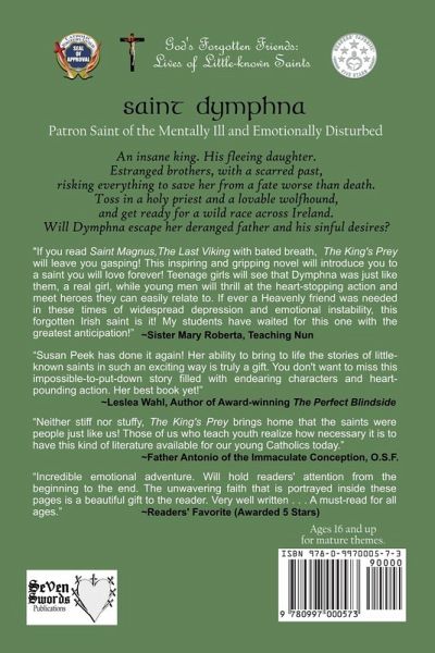 An insane king. His fleeing daughter. Estranged brothers, with a scarred past, risking everything to save her from a fate worse than death. Toss in a holy priest and a lovable wolfhound, and get ready for a wild race across Ireland. Will Dymphna escape her deranged father and his sinful desires? For the first time ever, the story of Saint Dymphna is brought to life in this dramatic novel for adults and older teens. With raw adventure, gripping action, and even humor in the midst of dark mental turmoil, Susan Peek's newest novel will introduce you to a saint you will love forever! Teenage girls will see that Dymphna was just like them, a real girl, while young men will thrill at the heart-stopping danger and meet heroes they can easily relate to. If ever a Heavenly friend was needed in these times of widespread depression and emotional instability, this forgotten Irish saint is it!