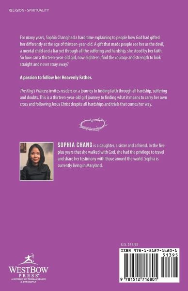 For many years, Sophia Chang had a hard time explaining to people how God had gifted her differently at the age of thirteen-year-old. A gift that made people see her as the devil, a mental child and a liar yet through all the suffering and hardship, she stood by her faith. So how can a thirteen-year-old girl, now eighteen, find the courage and strength to look straight and never stray away? A passion to follow her Heavenly Father. The King's Princess invites readers on a journey to finding faith through all hardship, suffering and doubts. This is a thirteen-year-old girl journey to finding what it means to carry her own cross and following Jesus Christ despite all hardships and trials that comes her way.