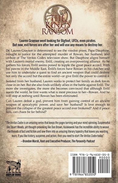 Lauren Grayson has encountered Bigfoot, UFOs, even pirates. But now she has to go head-to-head with a god... Dr. Lauren Grayson is determined to see the voodoo priest, Papa Dauphine, brought to justice for his attempted murder of Rowan, her husband and co-host of The Veritas Codex tv show. But Dauphine aligns himself with Lauren's mortal enemy, Enlil, creating an overpowering alliance. Dauphine captures Rowan and forces him to find an ancient weapon that could give Enlil the power to control the world, while Enlil gathers his forces to topple the greatest peace accord ever brokered. Isolated from her husband, Lauren works to protect her family as dark forces close in on her. The more she investigates, the more she becomes convinced that although Enril wants the world, he first wants what is most precious to her-Rowan. And he will stop at nothing until Rowan has been eliminated. Can Lauren defeat a god, prevent him from gaining control of an ancient weapon of apocalyptic power, and save her husband? Is love enough to prevent the collapse of the greatest peace accord ever brokered? And if peace fails, can worldwide chaos be far behind? Uncover the truth in The King's Ransom!