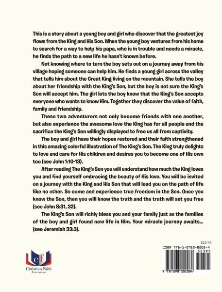 This is a story about a young boy and girl who discover that the greatest joy flows from the King and His Son. When the young boy ventures from his home to search for a way to help his papa, who is in trouble and needs a miracle, he finds the path to a new life he hasn't known before. Not knowing where to turn the boy sets out on a journey away from his village hoping that someone could help him. He finds a young girl across the valley that tells him about the Great King living on the mountain. She tells the boy about her friendship with the King's Son, but the boy is not sure the King's Son will accept him. The girl lets the boy know that the King's Son accepts everyone who wants to know Him. Together they discover the value of faith, family and friendship. These two adventurers not only become friends with one another, but also experience the awesome love the King has for all people and the sacrifice the King's Son willingly displayed to free us all from captivity. The boy and girl have their hopes restored and their faith strengthened in this amazing colorful illustration of The King's Son. The King truly delights to love and care for His children and invites you to become one of His own too (see John 1:10-13). After reading The King's Son you will understand how much the King loves you and find yourself embracing the beauty of His love. You will be invited on a journey with the King and His Son that will lead you on the path of life like no other. So come and experience true freedom in the Son. Once you know the Son, then you will know the truth and the truth will set you free (see John 8:31, 32). The King's Son will richly bless you and your family just as the families of the boy and girl found new life in Him. Your miracle journey awaits . . . (see Jeremiah 33:3).