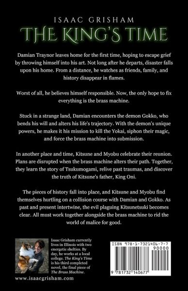 The world burns. Damian Traynor leaves home for the first time, hoping to escape grief by throwing himself into his art. Not long after he departs, disaster falls upon his home. From a distance, he watches as friends, family, and history disappear in flames. Worst of all, he believes himself responsible. Now, the only hope to fix everything is the brass machine. Stuck in a strange land, Damian encounters the demon Gokko, who bends his will and alters his life's trajectory. With the demon's unique powers, he makes it his mission to kill the Yokai, siphon their magic, and force the brass machine into submission. In another place and time, Kitsune and Myobu celebrate their reunion. Plans are disrupted when the brass machine alters their path. Together, they learn the story of Tsukumogami, relive past traumas, and discover the truth of Kitsune's father, King Oni. The pieces of history fall into place, and Kitsune and Myobu find themselves hurtling on a collision course with Damian and Gokko. As past and present intertwine, the evil plaguing Kitsunetsuki becomes clear. All must work together alongside the brass machine to rid the world of malice for good.