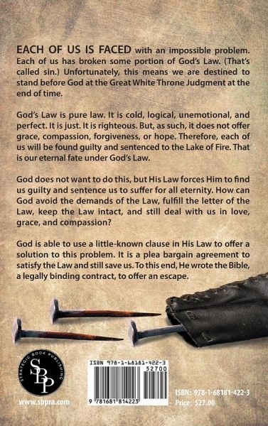 Each of us is faced with an impossible problem. Each of us has broken some portion of God's Law. (That's called sin.) Unfortunately, this means we are destined to stand before God at the Great White Throne Judgment at the end of time. God's Law is pure law. It is cold, logical, unemotional, and perfect. It is just. It is righteous. But, as such, it does not offer grace, compassion, forgiveness, or hope. Therefore, each of us will be found guilty and sentenced to the Lake of Fire. That is our eternal fate under God's Law. God does not want to do this, but His Law forces Him to find us guilty and sentence us to suffer for all eternity. How can God avoid the demands of the Law, fulfill the letter of the Law, keep the Law intact, and still deal with us in love, grace, and compassion? God is able to use a little-known clause in His Law to offer a solution to this problem. It is a plea bargain agreement to satisfy the Law and still save us. To this end, He wrote the Bible, a legally binding contract, to offer an escape.