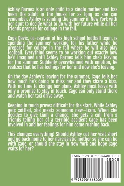 Ashley Barnes is an only child to a single mother and has been the adult in the house for as long as she can remember. Ashley is spending the summer in New York with her aunt to decide what to do with her future while all her friends prepare for college in the fall. Cage Davis, co-captain of his high school football team, is spending the summer working for his father while he prepares for college in the fall where he will also play football. Everything seems to be working out exactly how he'd imagined until Ashley Barnes tells him she's leaving for the summer. Suddenly, overwhelmed with emotion, he realizes that he has feelings for her and now she's leaving. On the day Ashley's leaving for the summer, Cage tells her how much he's going to miss her and they share a kiss. With no time to change her plans, Ashley must leave with only a promise to stay in touch. Cage can only stand there and watch her taxi drive away. Keeping in touch proves difficult from the start. While Ashley gets settled, she meets someone new-Liam. When she decides to give Liam a chance, she gets a call from a friend telling her of a terrible accident Cage has been involved in and her feelings for him come rushing back. This changes everything! Should Ashley cut her visit short and go back home to her narcissistic mother so she can be with Cage, or should she stay in New York and hope Cage waits for her?