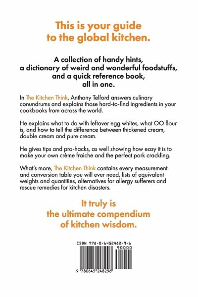 This is your guide to the global kitchen. A collection of handy hints, a dictionary of weird and wonderful foodstuffs, and a reference book, all in one. In The Kitchen Think Anthony Telford answers those culinary conundrums and explains those hard-to-find ingredients in your cookbooks from around the world. He tells you what to do with left over egg whites, what OO flour is, and how to tell the difference between thickened cream, double cream and pure cream. He gives tips and advice, showing how easy it is to make your own creme fraiche and the perfect pork crackling. What's more, The Kitchen Think contains every measurment and conversion table you'll ever need, lists of equivalent weights and quantities, alternatives for allergy sufferers and rescue remedies for kitchen disasters. It Is the ultimate compendium of kitchen wisdom.