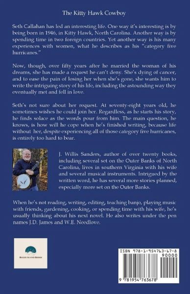 Seth Callahan has led an interesting life. One way it's interesting is by being born in 1946, in Kitty Hawk, North Carolina. Another way is by spending time in two foreign countries. Yet another way is his many experiences with women, what he describes as his "category five hurricanes." Now, though, over fifty years after he married the woman of his dreams, she has made a request he can't deny. She's dying of cancer, and to ease the pain of losing her when she's gone, she wants him to write the intriguing story of his life, including the astounding way they eventually met and fell in love. Seth's not sure about her request. At seventy-eight, he sometimes wishes he could join her. Regardless, as he starts his story, he finds solace as the words pour from him. The main question, he knows, is how will he cope when he's finished writing, because life without her, despite experiencing all of those category five hurricanes, is entirely too hard to bear. Book five of J. Willis Sanders' Outer Banks of North Carolina series returns us to the simple life in Kitty Hawk, North Carolina. Back then, in the 1950s, kids walked along sandy trails through live oak woods to the Up the Road school, attended the Methodist church in the area called Down the Road, and visited the general store for the mail and the latest news. Well removed from mainland North Carolina, Outer Banks residents worked hard, played hard, and, like Seth Callahan, loved to the depths of their souls.