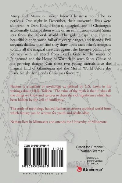 Misty and Mary-Lou never knew Christmas could be so perilous. One night in December, their uneventful lives were shattered. A Dark Knight from the magical land of Glamorgan accidentally kidnaps them while on an evil mission to steal Santa sets from the Mortal World. The girls escape and enter a beautiful hidden world full of mystery, danger, and friends. Evil servants shadow them and they draw upon each other's strengths to rally all the magical creatures against the Enemy's plans. They journey with all speed from Pearl's Gate to the mines of Pudgemud and the House of Warmth to warn Santa Clause of the growing danger. Can these two young mortals save the magical land of Glamorgan and the Mortal World before the Dark Knight King ends Christmas forever?