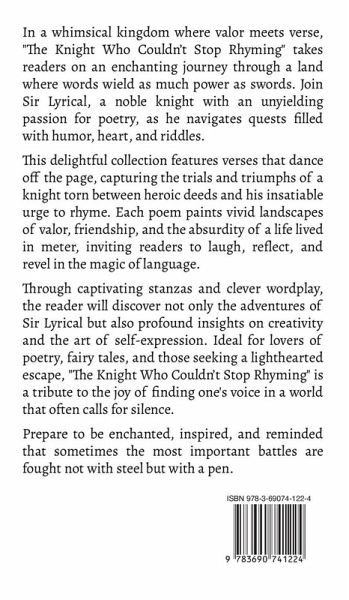 In a whimsical kingdom where valor meets verse, "The Knight Who Couldn't Stop Rhyming" takes readers on an enchanting journey through a land where words wield as much power as swords. Join Sir Lyrical, a noble knight with an unyielding passion for poetry, as he navigates quests filled with humor, heart, and riddles. This delightful collection features verses that dance off the page, capturing the trials and triumphs of a knight torn between heroic deeds and his insatiable urge to rhyme. Each poem paints vivid landscapes of valor, friendship, and the absurdity of a life lived in meter, inviting readers to laugh, reflect, and revel in the magic of language. Through captivating stanzas and clever wordplay, the reader will discover not only the adventures of Sir Lyrical but also profound insights on creativity and the art of self-expression. Ideal for lovers of poetry, fairy tales, and those seeking a lighthearted escape, "The Knight Who Couldn't Stop Rhyming" is a tribute to the joy of finding one's voice in a world that often calls for silence. Prepare to be enchanted, inspired, and reminded that sometimes the most important battles are fought not with steel but with a pen.