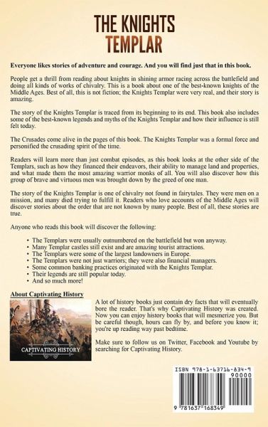 Everyone likes stories of adventure and courage. And you will find just that in this book. People get a thrill from reading about knights in shining armor racing across the battlefield and doing all kinds of works of chivalry. This is a book about one of the best-known knights of the Middle Ages. Best of all, this is not fiction; the Knights Templar were very real, and their story is amazing. The story of the Knights Templar is traced from its beginning to its end. This book also includes some of the best-known legends and myths of the Knights Templar and how their influence is still felt today. The Crusades come alive in the pages of this book. The Knights Templar was a formal force and personified the crusading spirit of the time. Readers will learn more than just combat episodes, as this book looks at the other side of the Templars, such as how they financed their endeavors, their ability to manage land and properties, and what made them the most amazing warrior monks of all. You will also discover how this group of brave and virtuous men was brought down by the greed of one man. The story of the Knights Templar is one of chivalry not found in fairytales. They were men on a mission, and many died trying to fulfill it. Readers who love accounts of the Middle Ages will discover stories about the order that are not known by many people. Best of all, these stories are true. Anyone who reads this book will discover the following: The Templars were usually outnumbered on the battlefield but won anyway. Many Templar castles still exist and are amazing tourist attractions. The Templars were some of the largest landowners in Europe. The Templars were not just warriors; they were also financial managers. Some common banking practices originated with the Knights Templar. Their legends are still popular today. And so much more!