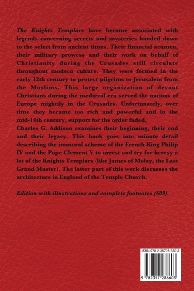 The Knights Templars have become associated with legends concerning secrets and mysteries handed down to the select from ancient times. Their financial acumen, their military prowess and their work on behalf of Christianity during the Crusades still circulate throughout modern culture. They were formed in the early 12th century to protect pilgrims to Jerusalem from the Muslims. This large organization of devout Christians during the medieval era served the nations of Europe mightily in the Crusades. Unfortunately, over time they became too rich and powerful and in the mid-14th century, support for the order faded. Charles G. Addison examines their beginning, their end and their legacy. This book goes into minute detail describing the immoral scheme of the French King Philip IV and the Pope Clement V to arrest and try for heresy a lot of the Knights Templars (like James of Molay, the Last Grand Master). The latter part of this work discusses the architecture in England of the Temple Church. Edition with illustrations and complete footnotes (609). Excerpt: "The extraordinary and romantic career of the Knights Templars, their exploits and their misfortunes, render their history a subject of peculiar interest. Born during the first fervour of the Crusades, they were flattered and aggrandized as long as their great military power and religious fanaticism could be made available for the support of the Eastern church and the retention of the Holy Land, but when the crescent had ultimately triumphed over the cross, and the religio-military enthusiasm of Christendom had died away, they encountered the basest ingratitude in return for the services they had rendered to the christian faith, and were plundered, persecuted, and condemned to a cruel death, by those who ought in justice to have been their defenders and supporters. The memory of these holy warriors is embalmed in all our recollections of the wars of the cross; they were the bulwarks of the Latin kingdom of Jerusalem during the short period of its existence, and were the last band of Europe's host that contended for the possession of Palestine."