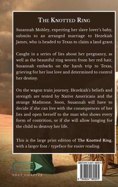 Susannah Mobley, expecting her slave lover's baby, submits to an arranged marriage to Hezekiah James, who is headed to Texas to claim a land grant. Caught in a series of lies about her pregnancy, as well as the beautiful ring woven from her red hair, Susannah embarks on the harsh trip to Texas, grieving for her lost love and determined to control her destiny. On the wagon train journey, Hezekiah's beliefs and strength are tested by Native Americans and the strange Madstone. Soon, Susannah will have to decide if she can live with the consequences of her lies and open herself to the man who shows every form of contrition, or if she will allow longing for the child to destroy her life. "Readers will be drawn in by McILvain's characters, who are richly developed with powerful voices. The tension crafted between Susannah's past and present is palpable throughout, and McILvain skillfully depicts her warring emotions" -BookLife Review- This is the large print edition of The Knotted Ring, with a larger font / typeface for easier reading.