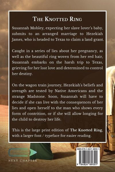 Susannah Mobley, expecting her slave lover's baby, submits to an arranged marriage to Hezekiah James, who is headed to Texas to claim a land grant. Caught in a series of lies about her pregnancy, as well as the beautiful ring woven from her red hair, Susannah embarks on the harsh trip to Texas, grieving for her lost love and determined to control her destiny. On the wagon train journey, Hezekiah's beliefs and strength are tested by Native Americans and the strange Madstone. Soon, Susannah will have to decide if she can live with the consequences of her lies and open herself to the man who shows every form of contrition, or if she will allow longing for the child to destroy her life. "Readers will be drawn in by McILvain's characters, who are richly developed with powerful voices. The tension crafted between Susannah's past and present is palpable throughout, and McILvain skillfully depicts her warring emotions" -BookLife Review- This is the large print edition of The Knotted Ring, with a larger font / typeface for easier reading.