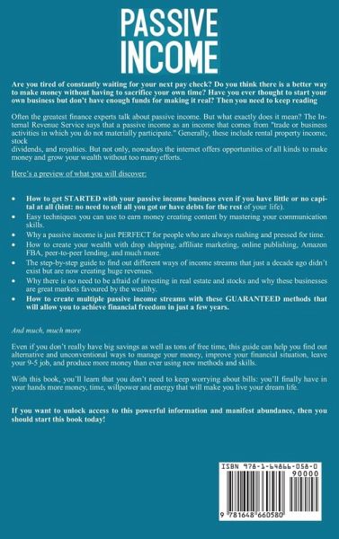 Are you tired of constantly waiting for your next paycheck? Do you think there is a better way to make money without having to sacrifice your own time? Have you ever thought to start your own business but don't have enough funds for making it real? Then you need to keep reading... Often the greatest finance experts talk about passive income. But what exactly does it mean? The Internal Revenue Service says that a passive income as an income that comes from "trade or business activities in which you do not materially participate." Generally, these include rental property income, stock dividends, and royalties. But not only, nowadays the internet offers opportunities of all kinds to make money and grow your wealth without too many efforts. Here's a preview of what you will discover:How to get STARTED with your passive income business even if you have little or no capital at all (hint: no need to sell all you got or have debts for the rest of your life). Easy techniques you can use to earn money creating content by mastering your communication skills. Why a passive income is just PERFECT for people who are always rushing and pressed for time. How to create your wealth with dropshipping, affiliate marketing, online publishing, Amazon FBA, peer-to-peer lending, and much more. The step-by-step guide to find out different ways of income streams that just a decade ago didn't exist but are now creating huge revenues. Why there is no need to be afraid of investing in real estate and stocks and why these businesses are great markets favored by the wealthy. How to create multiple passive income streams with these GUARANTEED methods that will allow you to achieve financial freedom in just a few years. And much, much more... Even if you don't really have big savings as well as tons of free time, this guide can help you find out alternative and unconventional ways to manage your money, improve your financial situation, leave your 9-5 job, and produce more money than ever using new methods and skills. With this book, you'll learn that you don't need to keep worrying about bills: you'll finally have in your hands more money, time, willpower and energy that will make you live your dream life. If you want to unlock access to this powerful information and manifest abundance, then you should start this book today!
