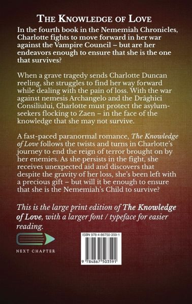 In the fourth book in the Nememiah Chronicles, Charlotte fights to move forward in her war against the Vampire Council - but are her endeavors enough to ensure that she is the one that survives? When a grave tragedy sends Charlotte Duncan reeling, she struggles to find her way forward while dealing with the pain of loss. With the war against nemesis Archangelo and the Drâghici Consiliului, Charlotte must protect the asylum-seekers flocking to Zaen - in the face of the knowledge that she may not survive. A fast-paced paranormal romance, The Knowledge of Love follows the twists and turns in Charlotte's journey to end the reign of terror brought on by her enemies. As she persists in the fight, she receives unexpected aid and discovers that despite the gravity of her loss, she's been left with a precious gift - but will it be enough to ensure that she is the Nememiah's Child to survive? This is the large print edition of The Knowledge Of Love, with a larger font / typeface for easier reading.