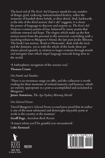 The kool-aid of The Kool-Aid Dispenser stands for any number of things: grief, enduring institutionalized foolery, either the nonsense of handed-down beliefs, or their denial. And, backwards, it is about the power of language to discover and surprise us. The Kool-Aid Dispenser contains poems of loss, balanced by as many that celebrate renewal and hope. The elegies which make up the first section move from the personal to the universal, concluding with a touching tribute to Musgrave's friend, the late poet Jordie Albiston. The book's last section, 'Koels to Newcastle', deals with the local and the domestic, yet as with the whole of the book, these are always placed squarely in relation to larger contexts through tensile and energetic lines which impel language towards being alive to the world.