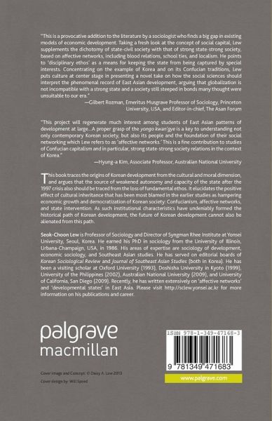 "This is a provocative addition to the literature, by a sociologist, who finds a big gap in existing models of economic development. Taking a fresh look at the concept of social capital, Lew supplements the dichotomy of state-civil society with that of strong state-strong society, based on affective networks, including blood relations, school ties, and localism. He points to 'disciplinary ethos' as a means for keeping the state from being captured by special interests. Concentrating on the example of Korea and on its Confucian traditions, Lew puts culture at center stage in presenting a novel take on how the social sciences should interpret the phenomenal record of East Asian development, arguing that globalization is not incompatible with a strong state and a society still steeped in bonds many thought were unsuitable to our era." - Gilbert Rozman, Emeritus Musgrave Professor of Sociology, Princeton University, USA, and Editor-in-chief, The Asan Forum
