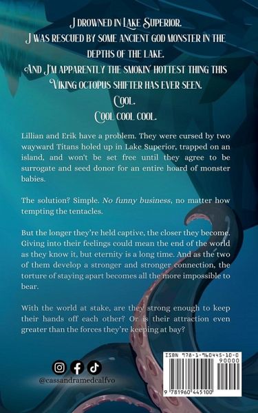 I drowned in Lake Superior. I was rescued by some ancient god monster in the depths of the lake. I've got gills now, that's fun. And I'm apparently the smokin' hottest thing this Viking octopus shifter has ever seen. Cool. Cool cool cool. Lillian and Erik have a problem. They were cursed by two wayward Titans holed up in Lake Superior, trapped on an island, and won't be set free until they agree to be surrogate and seed donor for an entire hoard of monster babies. The solution? Simple. No funny business, no matter how tempting the tentacles. But the longer they're held captive, the closer they become. Giving into their feelings could mean the end of the world as they know it, but eternity is a long time. And as the two of them develop a stronger and stronger connection, the torture of staying apart becomes all the more impossible to bear. With the world at stake, are they strong enough to keep their hands off each other? Or is their attraction even greater than the forces they're keeping at bay?