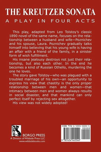 This play, adapted from Leo Tolstoy's classic 1890 novel of the same name, focuses on the relationship between a husband and wife--Poznichev and his spouse, Laura. Poznichev gradually talks himself into believing that his young wife is having an affair with a friend of the family, in a sinister form of wish fulfillment. His insane jealousy destroys not just their relationship, but also each other. In the end he becomes a kind of Russian Othello, murdering the one he loves. The story gave Tolstoy--who was plagued with a troubled marriage of his own--an opportunity to express his view that chastity is the only proper relationship between men and women--that intimacy between men and women always results in social disaster, and that mankind can only perfect itself by rejecting sex altogether. His view was not widely adopted!