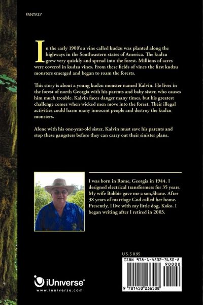 In the early 1900's a vine called kudzu was planted along the highways in the Southeastern States of America. The kudzu grew very quickly and spread into the forest. Millions of acres were covered in kudzu vines. From these fields of vines the first kudzu monsters emerged and began to roam the forests. This story is about a young kudzu monster named Kalvin. He lives in the forest of North Georgia with his parents and baby sister, who causes him much trouble. Kalvin faces danger many times, but his greatest challenge comes when wicked men move into the forest. Their illegal activities could harm many innocent people and destroy the kudzu monsters. Alone with his one-year-old sister, Kalvin must save his parents and stop these gangsters before they can carry out their sinister plans.
