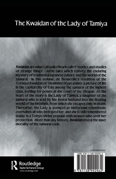 First published in 2001. Kwaidan are what Lafcadio Hearn calls 'stories and studies of strange things' - eerie tales which convey the enduring mystery of traditional Japanese culture and the world of the samurai. In this volume, de Benneville's rendition of the Yotsuya Kwaidan of Shunkintei Ryuo paints a picture of life in the capital city of Edo among the samurai of the highest class, jostling for power at the court of the Shogun. At the heart of the story is the Lady of Tamiya, a daughter of the samurai who is sold by her brutal husband into the floating world of brothels, from which she escapes only in death. Thereafter, the Lady is avenged as mis-forutune relentlessly overtakes all who betrayed her, and she is still remembered today in a Tokyo shrine popular with women who seek her protection. More than any history, kwaidan reveal the inner morality of the samurai code.