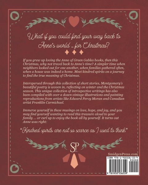 What if you could find your way back to Anne's world ... for Christmas? If you grew up loving the Anne of Green Gables books, then this Christmas, why not travel back to Anne's time? A simpler time when neighbors looked out for one another, when families gathered often, when a house was indeed a home. Meet kindred spirits on a journey to find the true meaning of Christmas. Specially curated for every L.M. Montgomery fan and combined with inspiring artwork, these heartwarming stories in our 8x10 premium color edition will thrill you as you enjoy both familiar characters and some you may not have met before.Revisit Anne Shirley as she receives Matthew's surprise gift: a dress with puffed sleeves! Eavesdrop as the Story Girl shares about the little harpist-shepherd and what happened on that first Christmas morning. Meet the Young family, divided by a feud, and discover how miscommunication brings forgiveness. Interspersed throughout the collection, Montgomery's beautiful poetry is woven in, reflecting on winter and the Christmas season. This unique collection of L.M. Montgomery's Christmas writings have also been compiled with over a dozen paintings and illustrations, from artists like Edward Percy Moran and Canadian artist Franklin Carmichael. Immerse yourself in these musings on love, hope, and joy, and you may find yourself wanting to read this treasure aloud to your family ... or curl up to enjoy the book all by yourself. You, too, can experience the Smidgen Press excellence and attention to beauty as you delight to hold this book in your hands. It turns out Anne was right:"Kindred spirits are not so scarce as I used to think."