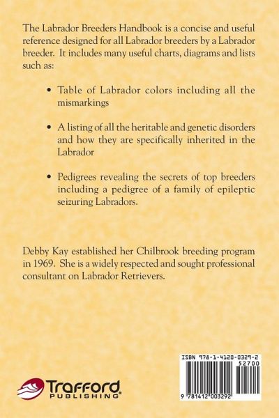 The Labrador Breeders Handbook is a concise and useful reference designed for all Labrador breeders by a Labrador breeder. It includes many useful charts, diagrams and lists such as: Table of Labrador colors including all the mismarkings A listing of all the heritable and genetic disorders and how they are specifically inherited in the Labrador Pedigrees revealing the secrets of top breeders including a pedigree of a family of epileptic seizuring Labradors.