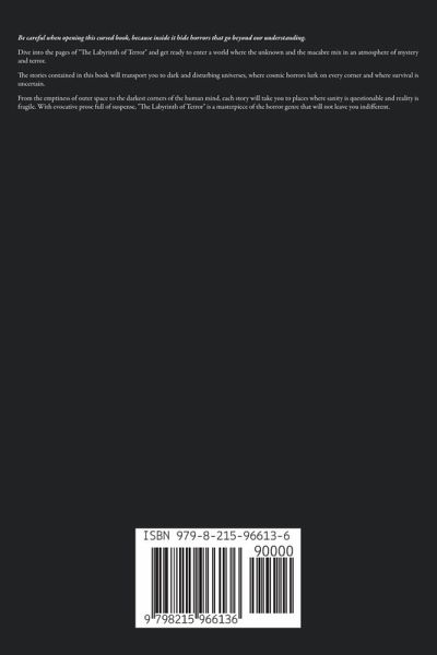 Be careful when opening this cursed book, because inside it hide horrors that go beyond our understanding. Dive into the pages of "The Labyrinth of Terror" and get ready to enter a world where the unknown and the macabre mix in an atmosphere of mystery and terror. The stories contained in this book will transport you to dark and disturbing universes, where cosmic horrors lurk on every corner and where survival is uncertain. From the emptiness of outer space to the darkest corners of the human mind, each story will take you to places where sanity is questionable and reality is fragile. With evocative prose full of suspense, "The Labyrinth of Terror" is a masterpiece of the horror genre that will not leave you indifferent.