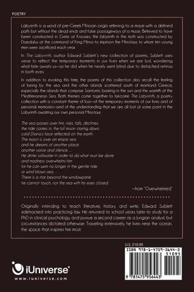 Labyrinth is a word of pre-Greek Minoan origin referring to a maze with a defined path but without the dead ends and false passageways of a maze. Believed to have been constructed in Crete at Knosses, the labyrinth in the myth was constructed by Daedalus at the command of King Minos to imprison the Minotaur, to whom ten young men were sacrificed each year. In The Labyrinth, author Edward Sublett's new collection of poems, Sublett uses verse to reflect the temporary moments in our lives when we are lost, wondering what fate awaits us-as he did when he nearly went blind due to detached retinas in both eyes. In addition to evoking this time, the poems of this collection also recall the feeling of being by the sea and the other islands scattered south of mainland Greece, especially the islands that comprise Santorini, basking in the sun and the warmth of the Mediterranean Sea. Both themes come together to become The Labyrinth, a poetry collection with a constant theme of loss-of the temporary moments of our lives and of personal memories-and of the understanding that we are all lost at some point in the Labyrinth awaiting our own personal Minotaur. The sea passes over him, rises, falls, declines; the tide comes in, the full moon staring down, cold Diana's face reflected on the earth. The moon is over an empty sea and he dreams of another place another voice and silence... He drinks saltwater in order to do what must be done and madness overwhelms him for he can swim no longer in the gentle tide or wind blown sea... There is a star beyond the windowpane he cannot touch, nor the sea with his eyes closed. -from "Overwhelmed"
