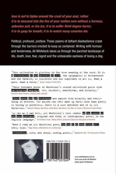 love is not to tiptoe around the crust of your soul, rather it is to descend into the fire of your molten core without a harness, asbestos suit, or dry ice; it is to suffer third-degree burns; it is to gasp for breath; it is to watch canaries die. Political, profound, profane. These poems of defiant disobedience crash through the barriers erected to keep us contained. Writing with humour and tenderness, Ali Whitelock takes us through the parched landscape of life, death, love, fear, regret and the unbearable sadness of losing a dog. And particularly topical in the aftermath of the destructive Australia-wide fires, the powerful 'this is coal don't be afraid' is a found poem made up of statements by Prime Minister Scott Morrison, the Rural Fire Service, as well as relevant tweets and quotes, collated to create an extraordinary piece to make us shiver. this is coal don't be scared don't be afraid seek shelter from the heat of the fire. but look, the girls and jen, they love holidaying in hawaii and so we've had a few nice days here. drink water to prevent dehydration evacuate your horse to the beach have your children row for their lives. australians will be inspired by the great feats of our cricketers this is not about climate change