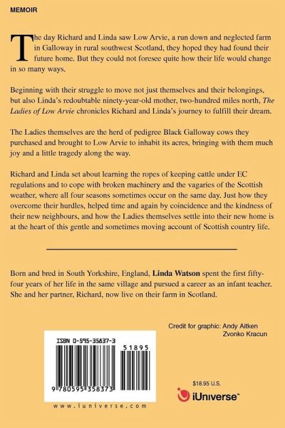 The day Richard and Linda saw Low Arvie, a run down and neglected farm in Galloway in rural southwest Scotland, they hoped they had found their future home. But they could not foresee quite how their life would change in so many ways. Beginning with their struggle to move not just themselves and their belongings, but also Linda's redoubtable ninety-year-old mother, two-hundred miles north, The Ladies of Low Arvie chronicles Richard and Linda's journey to fulfill their dream. The Ladies themselves are the herd of pedigree Black Galloway cows they purchased and brought to Low Arvie to inhabit its acres, bringing with them much joy and a little tragedy along the way. Richard and Linda set about learning the ropes of keeping cattle under EC regulations and to cope with broken machinery and the vagaries of the Scottish weather, where all four seasons sometimes occur on the same day. Just how they overcome their hurdles, helped time and again by coincidence and the kindness of their new neighbours, and how the Ladies themselves settle into their new home is at the heart of this gentle and sometimes moving account of Scottish country life.