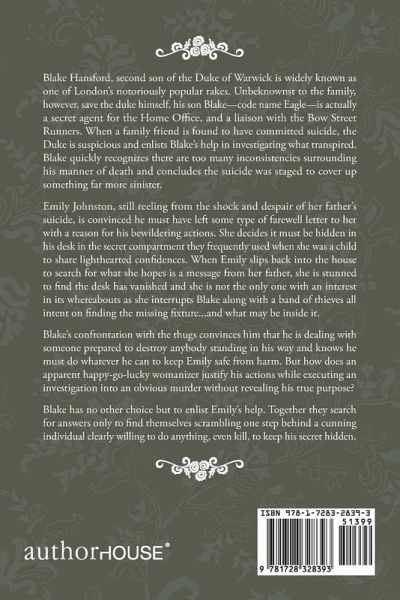Blake Hansford, second son of the Duke of Warwick is widely known as one of London's notoriously popular rakes. Unbeknownst to the family, however, save the duke himself, his son Blake-code name Eagle-is actually a secret agent for the Home Office, and a liaison with the Bow Street Runners. When a family friend is found to have committed suicide, the Duke is suspicious and enlists Blake's help in investigating what transpired. Blake quickly recognizes there are too many inconsistencies surrounding his manner of death and concludes the suicide was staged to cover up something far more sinister. Emily Johnston, still reeling from the shock and despair of her father's suicide, is convinced he must have left some type of farewell letter to her with a reason for his bewildering actions. She decides it must be hidden in his desk in the secret compartment they frequently used when she was a child to share lighthearted confidences. When Emily slips back into the house to search for what she hopes is a message from her father, she is stunned to find the desk has vanished and she is not the only one with an interest in its whereabouts as she interrupts Blake along with a band of thieves all intent on finding the missing fixture...and what may be inside it. Blake's confrontation with the thugs convinces him that he is dealing with someone prepared to destroy anybody standing in his way and knows he must do whatever he can to keep Emily safe from harm. But how does an apparent happy-go-lucky womanizer justify his actions while executing an investigation into an obvious murder without revealing his true purpose? Blake has no other choice but to enlist Emily's help. Together they search for answers only to find themselves scrambling one step behind a cunning individual clearly willing to do anything, even kill, to keep his secret hidden.