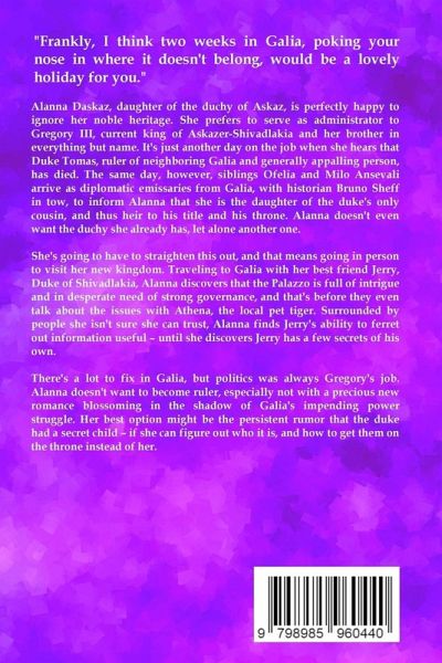 Alanna Daskaz, daughter of the duchy of Askaz, is perfectly happy to ignore her noble heritage. She prefers to serve as administrator to Gregory III, current king of Askazer-Shivadlakia and her brother in everything but name. It's just another day on the job when she hears that Duke Tomas, ruler of neighboring Galia and generally appalling person, has died. The same day, however, siblings Ofelia and Milo Ansevali arrive as diplomatic emissaries from Galia, with historian Bruno Sheff in tow, to inform Alanna that she is the daughter of the duke's only cousin, and thus heir to his title and his throne. Alanna doesn't even want the duchy she already has, let alone another one. She's going to have to straighten this out, and that means going in person to visit her new kingdom. Traveling to Galia with her best friend Jerry, Duke of Shivadlakia, Alanna discovers that the Palazzo is full of intrigue and in desperate need of strong governance, and that's before they even talk about the issues with Athena, the local pet tiger. Surrounded by people she isn't sure she can trust, Alanna finds Jerry's ability to ferret out information useful - until she discovers Jerry has a few secrets of his own. There's a lot to fix in Galia, but politics was always Gregory's job. Alanna doesn't want to become ruler, especially not with a precious new romance blossoming in the shadow of Galia's impending power struggle. Her best option might be the persistent rumor that the duke had a secret child - if she can figure out who it is, and how to get them on the throne instead of her. The Lady And The Tiger has a total wordcount of roughly 70K words.