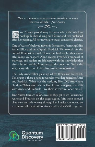 There are so many characters to be described, so many stories to be told." -Jane Austen Jane Austen passed away far too early, with only four books published during her lifetime and two published after her passing. All her novels are today considered classics. One of Austen's beloved novels is Persuasion, featuring Miss Anne Elliot and her Captain Fredrick Wentworth. At the end of Persuasion, both characters find each other again after many years apart. Anne accepts Fredrick's proposal of marriage, and readers are left happy with the knowledge that after a bit of trouble, Anne gets all she hopes for. Sadly, the story leaves the rest of their lives to our imagination. The Lady Anne Elliot picks up where Persuasion leaves off. No longer is there a need to wonder what happened to Anne and Fredrick. What was the wedding like? Did Anne have children? What was their life like? Open these pages and visit with Anne and Fredrick. Live their adventures once more! Jane Austen fans are in for a treat as they get to see Persuasion's Anne and Fredrick on the pages again. Join these beloved characters on their journey through life. I invite you to read on to discover all the details of Anne and Fredrick's life together.
