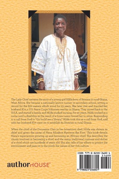The Lady Chief narrates the story of a young girl Hilda born of farmers in rural Ghana, West Africa. She became a nationally known runner in secondary school, setting a record for the 800 meters which stood for 23 years. She later met and married her husband Kirt, a U.S. Peace Corps Volunteer teacher in Ghana. They moved back to the U.S.A. and started a family, and Hilda studied nursing. For 20 years, Hilda worked as a nurse until a disability as the result of a brain tumor forced her to retire. Responding to a call from God to "Go build me a library," Hilda took this as a call from God, and with her husband Kirt went on to establish 64 libraries in rural Ghana. When the chief of the Dwumana Clan in her hometown died, Hilda was chosen as chief and given the name of Nana Afoakwa Kyerewa the First. This book details Nana's experiences growing up and becoming an African chief. She describes the rituals involved in becoming a chief, and the many traditional customs and duties of a chief which are hundreds of years old. She also tells of her efforts to protect the environment and pass on to the youth the values of her rich culture.