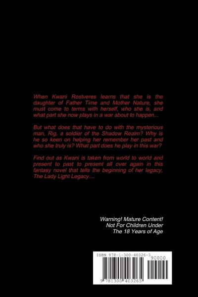 When Kwani Rostveres learns that she is the daughter of Father Time and Mother Nature, she must come to terms with herself, who she really is, and what part she now plays in a war about to happen... But what does that have to do with the mysterious man, Rig, a soldier of the Shadow Realm? Why is he so keen on helping her remember her past and who she really is? What part does he play in this war? Find out as Kwani is taken from world to world and present to past to present all over again in this fantasy novel that tells the beginning of her legacy, The Lady Light Legacy...
