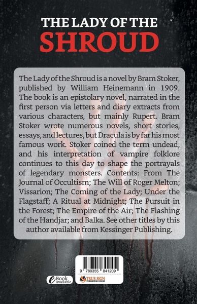 The Lady of the Shroud is a novel by Bram Stoker, published by William Heinemann in 1909. The book is an epistolary novel, narrated in the first person via letters and diary extracts from various characters, but mainly Rupert. Bram Stoker wrote numerous novels, short stories, essays, and lectures, but Dracula is by far his most famous work. Stoker coined the term undead, and his interpretation of vampire folklore continues to this day to shape the portrayals of legendary monsters. Contents: From The Journal of Occultism; The Will of Roger Melton; Vissarion; The Coming of the Lady; Under the Flagstaff; A Ritual at Midnight; The Pursuit in the Forest; The Empire of the Air; The Flashing of the Handjar; and Balka. See other titles by this author available from Kessinger Publishing.