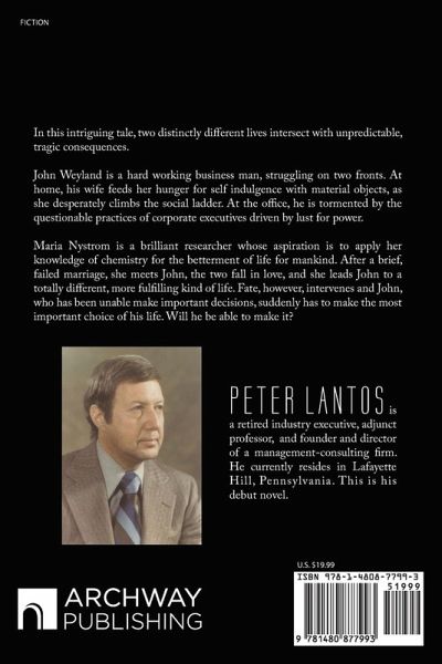 In this intriguing tale, two distinctly different lives intersect with unpredictable, tragic consequences. John Weyland is a hard working business man, struggling on two fronts. At home, his wife feeds her hunger for self indulgence with material objects, as she desperately climbs the social ladder. At the office, he is tormented by the questionable practices of corporate executives driven by lust for power. Maria Nystrom is a brilliant researcher whose aspiration is to apply her knowledge of chemistry for the betterment of life for mankind. After a brief, failed marriage, she meets John, the two fall in love, and she leads John to a totally different, more fulfilling kind of life. Fate, however, intervenes and John, who has been unable make important decisions, suddenly has to make the most important choice of his life. Will he be able to make it?