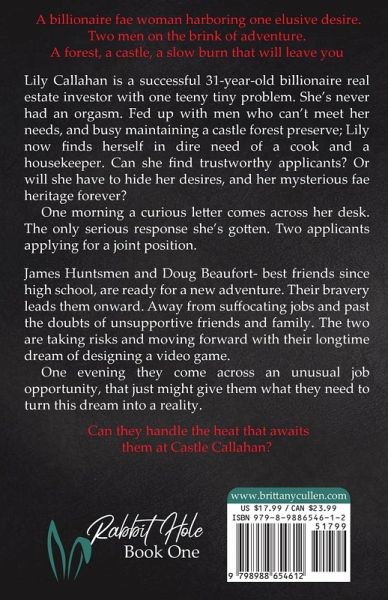 A billionaire fae woman harboring one elusive desire.Two men on the brink of adventure.A forest, a castle, a slow burn that will leave you quaking. Lily Callahan is a successful 31-year-old billionaire real estate investor with one teeny tiny problem. She's never had an orgasm. Fed up with men who can't meet her needs, and busy maintaining a castle forest preserve; Lily now finds herself in dire need of a cook and a housekeeper. Can she find trustworthy applicants? Or will she have to hide her desires, and her mysterious fae heritage forever? One morning a curious letter comes across her desk. The only serious response she's gotten. Two applicants applying for a joint position. James Huntsmen and Doug Beaufort- best friends since high school, are ready for a new adventure. Their bravery leads them onward. Away from suffocating jobs and past the doubts of unsupportive friends and family. The two are taking risks and moving forward with their longtime dream of designing a video game. One evening they come across an unusual job opportunity, that just might give them what they need to turn this dream into a reality. Can they handle the heat that awaits them at Castle Callahan? ... A slow-burn billionaire boss romance. Featuring Lily, Doug, and James. Book one in The Rabbit Hole series. Each book follows a different couple or triple, in their own standalone romance. Take a step into a magical world of Vampires, Fae, Shifters, and more. Laugh. Dance. Cry. Fall in love. Walk through the door and see just how deep you can go. ...CONTENT GUIDANCE: This book contains graphic sexual content and language. Mention of forced sexual activity, violence, and witchcraft. Extra spice included for your pleasure: side characters from the LGBTQ+ community, Vampires, Fae, and Witches OH MY! ...Sign up for The Rabbit Hole Gazette! Get exclusive content and updates on the release of the next book at https://www.brittanycullen.com