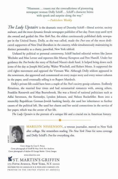The Lady Upstairs is the dramatic story of Dorothy Schiff-liberal activist, society stalwart, and the most dynamic female newspaper publisher of her day. From 1939 until 1976 she owned and guided the New York Post, the oldest continuously published daily newspaper in the United States. Dolly, as she was called, made the Post one of the most dedicated supporters of New Deal liberalism in the country, while simultaneously maintaining its distinct personality as a chatty, parochial, New York tabloid. Unfazed by political or personal controversy, Schiff backed editorial writers like James Wechsler and Max Lerner and reporters like Murray Kempton and Pete Hamill. Under her guidance the Post broke the story of Richard Nixon's slush fund. It helped bring down such icons of the day as Joseph McCarthy, Walter Winchell, and Robert Moses. It supported the civil rights movement and opposed the Vietnam War. Although Dolly seldom appeared in the newsroom, she approved and commented on every major story and every minor column in the paper, until eventually selling it to Rupert Murdoch. Dolly's private life could have been a staple of the Post's society gossip columns. Endlessly flirtatious, she married four times and had extramarital romances with, among others, Franklin Roosevelt and Max Beaverbrook. She was a friend of national politicians such as Adlai Stevenson, the Kennedys, Lyndon Johnson, and Nelson Rockefeller. Born into a staunchly Republican German-Jewish banking family, she used her inheritance to further causes of the political left. She used her charm and her social connections in the service of her paper, which was the center of her life. The Lady Upstairs is the portrait of a unique life and a crucial era in American history.