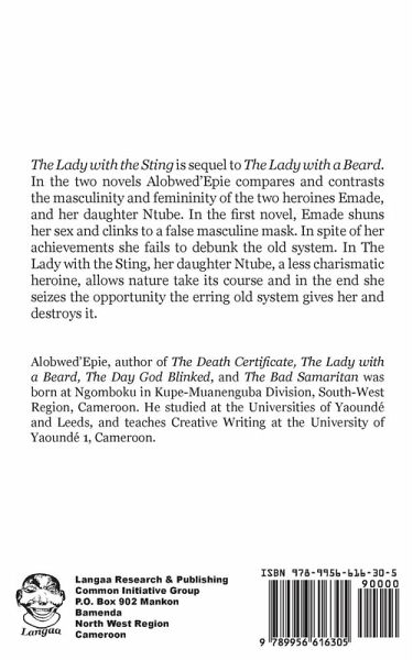 The Lady with the Sting is sequel to The Lady with a Beard. In the two novels Alobwed'Epie compares and contrasts the masculinity and femininity of the two heroines Emade, and her daughter Ntube. In the first novel, Emade shuns her sex and clinks to a false masculine mask. In spite of her achievements she fails to debunk the old system. In The Lady with the Sting, her daughter Ntube, a less charismatic heroine, allows nature take its course and in the end she seizes the opportunity the erring old system gives her and destroys it. Alobwed'Epie, author of The Death Certificate, The Lady with a Beard, The Day God Blinked, and The Bad Samaritan was born at Ngomboku in Kupe-Muanenguba Division, South-West Region, Cameroon. He studied at the Universities of Yaoundé and Leeds, and teaches Creative Writing at the University of Yaoundé 1, Cameroon.