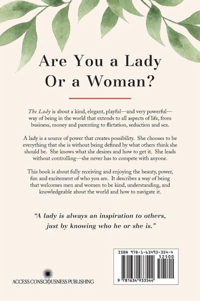 Are You a Lady or a Woman? The Lady is about a kind, elegant, playful—and very powerful—way of being in the world that extends to all aspects of life, from business, money and parenting to flirtation, seduction and sex. A lady is a source of power that creates possibility. She chooses to be everything that she is without being defined by what others think she should be. She knows what she desires and how to get it. She leads without controlling—she never has to compete with anyone. This book is about fully receiving and enjoying the beauty, power, fun and excitement of who you are. It describes a way of being that welcomes men and women to be kind, understanding, and knowledgeable about the world and how to navigate it. "A lady is always an inspiration to others, just by knowing who he or she is."